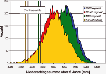 Je nach betrachtetem Klimatrend liegt die 5%-Perzentile für die Klimavariante 4 „Lang anhaltende Trockenperiode zwischen 2011 und 2035“ bei 4632 mm Niederschlag in 5 Jahren bzw. 926 mm Niederschlag pro Jahr (Klimatrend IPCC regional), bei 4450 mm in 5 Jahren bzw. 890 mm pro Jahr (Klimatrend REMO regional), bei 4605 mm in 5 Jahren bzw. 921 mm pro Jahr (Klimatrend MM5 regional) und nur bei 4426 mm Niederschlag in 5 Jahren bzw. 885 mm pro Jahr für den Klimatrend Fortschreibung. Dem steht ein mittlerer Jahresniederschlag von 1040 mm/a mit einer Standardabweichung von 130 mm/a in der Periode 1960 bis 2006 gegenüber.