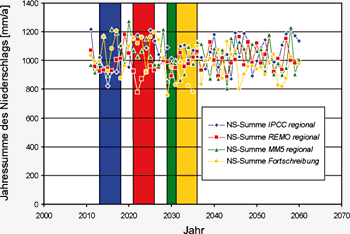 Abbildung S4.3 zeigt den Verlauf der jährlichen Niederschlagssummen in den ausgewählten Klimavarianten in der Periode von 2011 bis 2060 für die 4 Klimatrends. Die Perioden besonderer Trokkenheit sind mit farbigen Zeitfenstern gekennzeichnet. Die vier unterschiedlichen 5-jährigen Trockenperioden mit ihrem jeweiligen Beginn in den Jahren 2013 (IPCC regional), 2021 (REMO regional), 2029 (MM5 regional) und 2031 (Fortschreibung) sind auch ohne die farbige Markierung deutlich zu erkennen.