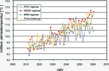 Abbildung S4.5: Verlauf der jährlichen Mitteltemperaturen der gewählten Realisierungen von Klimavariante 1 für die vier Klimatrends IPCC regional, REMO regional, MM5 regional und Fortschreibung.