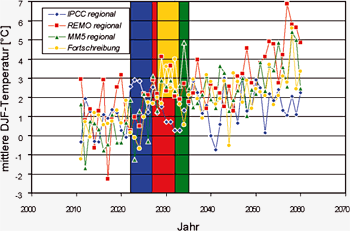Abbildung S4.7: Verlauf der jährlichen mittleren Winter-Temperaturen (DJF) der ausgewählten Realisierungen von Klimavariante 2 für die vier Klimatrends IPCC regional, REMO regional, MM5 regional und Fortschreibung.