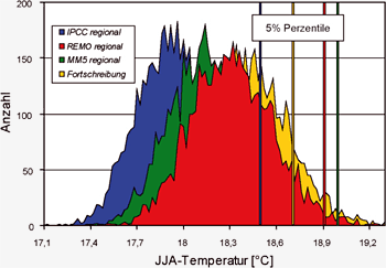 In Abbildung S4.9 ist der Verlauf der mittleren Sommertemperaturen im Einzugsgebiet der Oberen Donau für die vier gewählten Realisierungen der vier Klimatrends auf der 5%-Perzentile dargestellt. Die Perioden heißer Sommer liegen mit ihrem jeweiligen Beginn in den Jahren 2031 (Klimatrend IPCC regional), 2026 (Klimatrend REMO regional), 2028 (Klimatrend MM5 regional) und 2029 (Klimatrend Fortschreibung) sehr nahe beieinander.